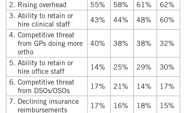Despite the relative stability in production, the survey paints a more complex picture regarding profitability. The average orthodontic practice overhead percentage reached 56.5% in 2025, translating to an average profit of 43.5% of revenue. These figures represent a slight deterioration from 2024, with overhead increasing and profit margins narrowing. A concerning 51.4% of practices reported higher overhead in 2025 compared to the previous year, a trend that appears to be cementing itself in the profession. Only 10% of orthodontists managed to reduce their total overhead. This upward trajectory of operating costs has made overhead the second biggest challenge cited by practitioners.